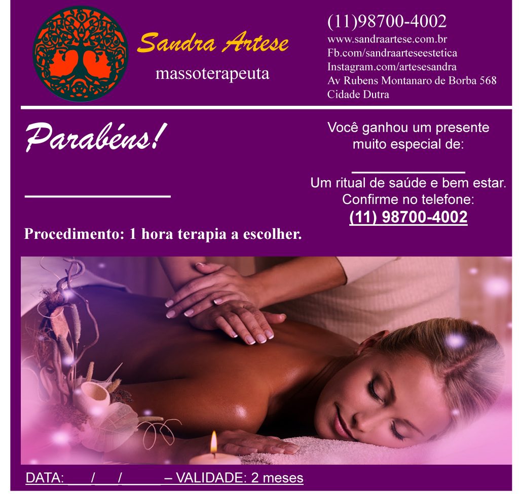 Bem-vindo! Sou Sandra Artese, massoterapeuta especializada em proporcionar experiências de relaxamento e alívio para corpo e mente.